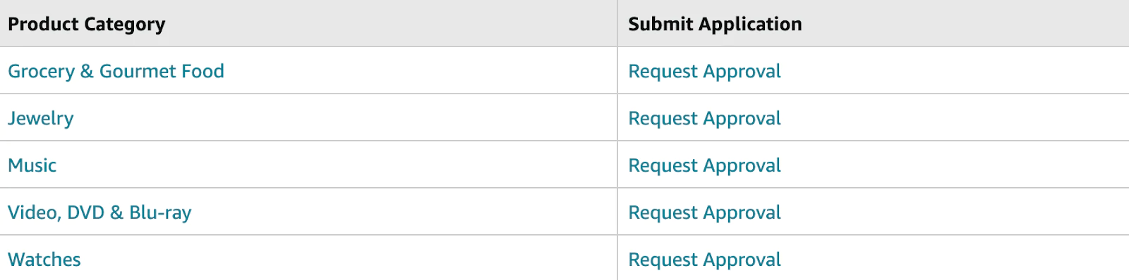 Amazon mengharuskan penjual untuk mendapatkan persetujuan untuk jenis produk tertentu. Mode, bahan makanan, musik, dan perhiasan adalah kategori populer yang memerlukan persetujuan sebelum menyiapkan toko Amazon Anda. Baca ikhtisar kategori produk tempat Anda dapat menjual.