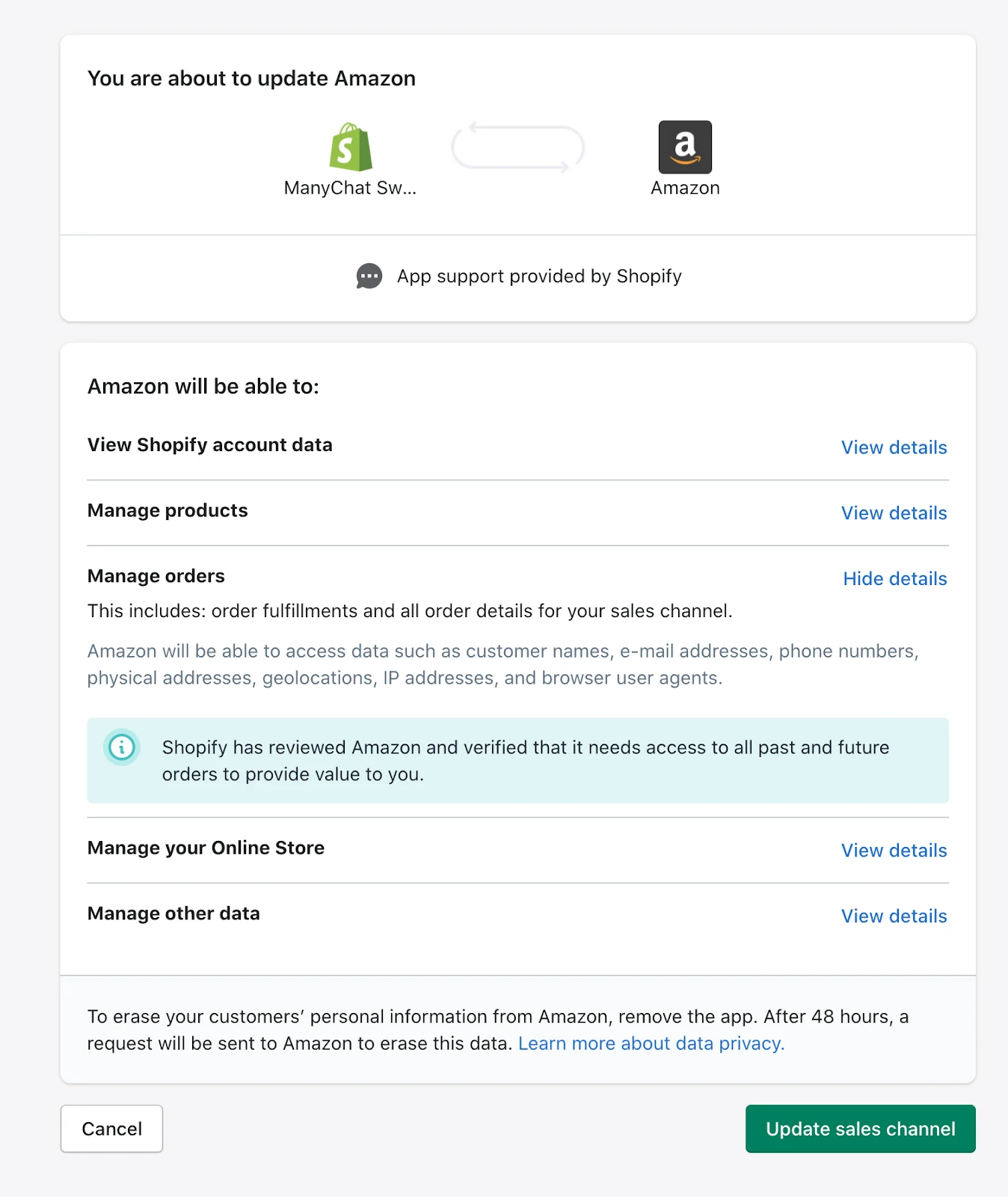 - Aplikasi saluran Amazon . Aplikasi Shopify gratis ini membantu Anda mengelola inventaris Amazon dan memenuhi pesanan Amazon dari admin Shopify Anda. Anda dapat dengan mudah membuat daftar Amazon untuk produk Shopify Anda, melacak inventaris, dan memantau penjualan menggunakan halaman Tinjauan Penjualan dan Analisis Anda. Dengan cara ini Anda tidak perlu meninggalkan Shopify untuk menjual di banyak pasar.