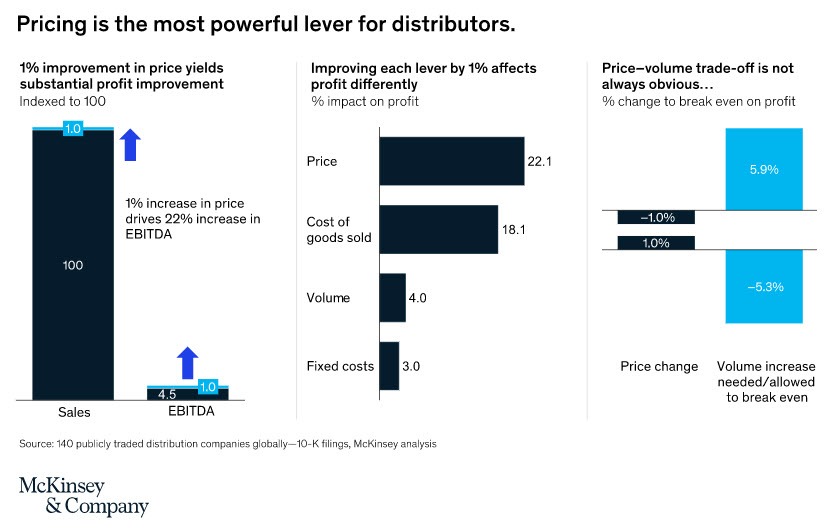 Misalnya, perwakilan penjualan membulatkan harga ke dolar terdekat atau menawarkan margin terpisah. Mungkin terdengar sepele, tapi sebenarnya kebalikannya. Penurunan harga sebesar 1% saja akan membutuhkan distributor untuk meningkatkan penjualan mereka hampir 6% untuk mencapai hasil yang sama.