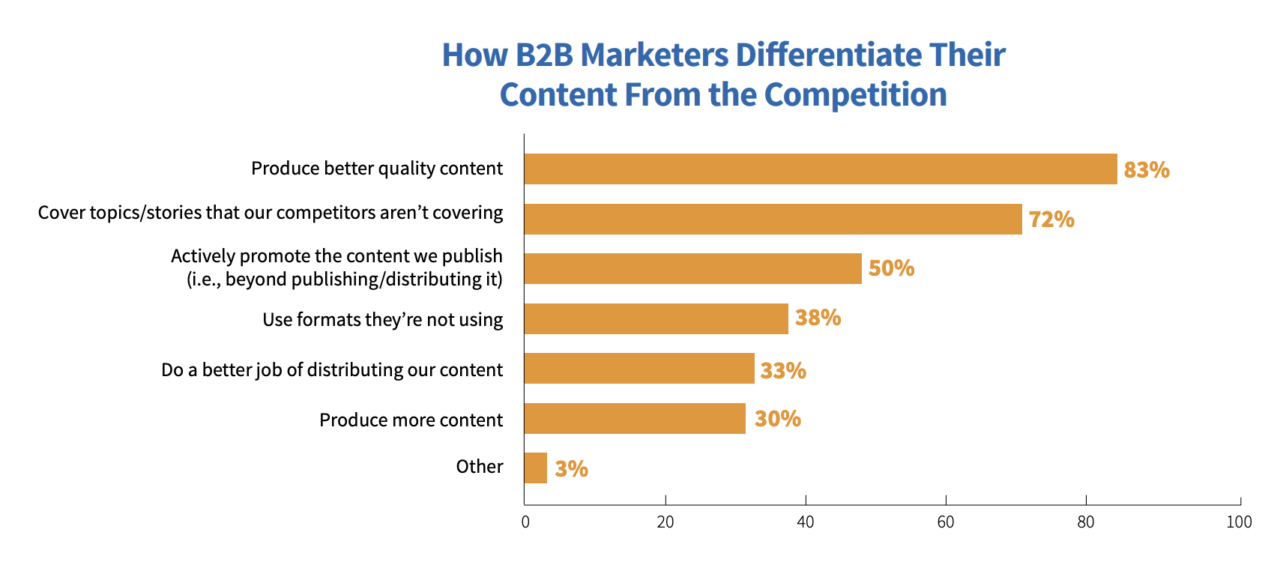 - 83% pemasar fokus pada pembuatan konten berkualitas terbaik sebagai sarana utama mereka untuk menonjol dalam persaingan. (Institut Pemasaran Konten)