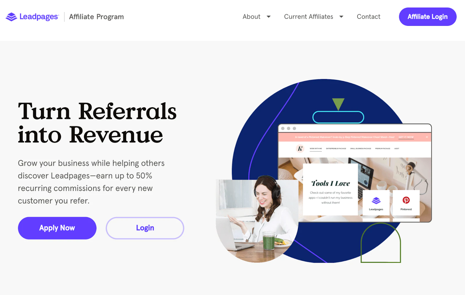 halaman utama adalah pembuat situs web populer yang membantu bisnis kecil membangun halaman arahan dan penjualan. Program afiliasi terkemuka di industrinya menawarkan hingga 50% komisi berulang untuk setiap penjualan yang Anda hasilkan (termasuk pembaruan paket, pembaruan, dan pembelian satu kali). Program ini terbuka untuk semua orang, baik Anda menggunakan Leadpages atau tidak.