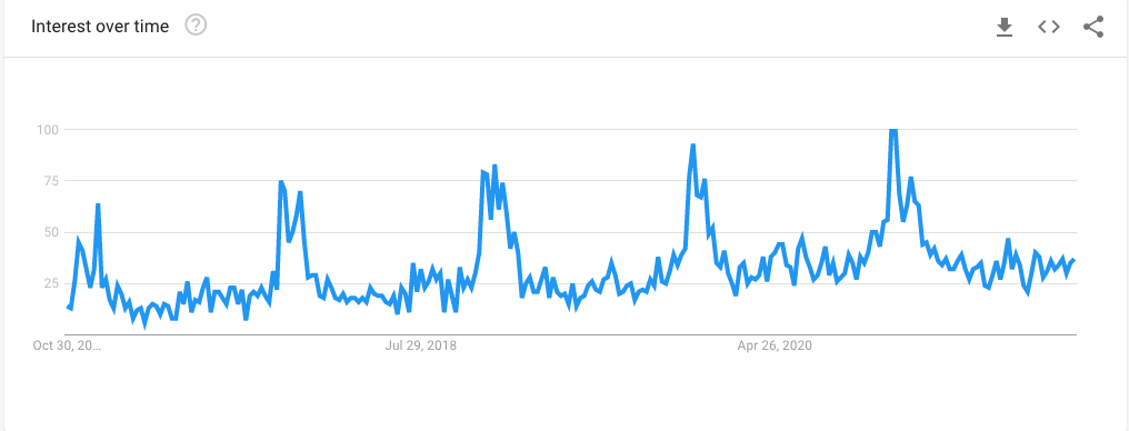 Secara keseluruhan, volume pencarian telah meningkat selama beberapa tahun terakhir, dengan pencarian memuncak di musim panas.