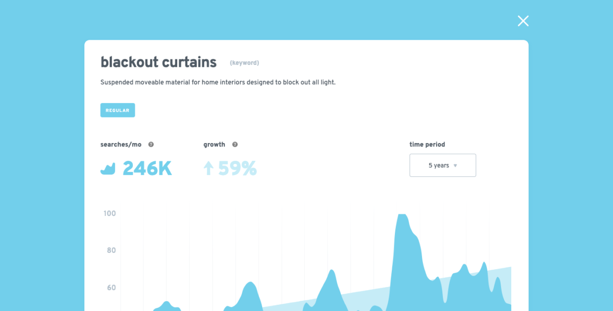 Tirai ini adalah potongan kain buram yang dirancang untuk menghalangi semua cahaya. Seperti masker tidur, mereka bagus untuk mereka yang perlu tidur di siang hari. Mereka juga bagus untuk efisiensi energi. Exploding Topics menunjukkan ada 246 ribu pencarian bulanan dan pertumbuhan 59% dalam volume pencarian selama lima tahun terakhir.