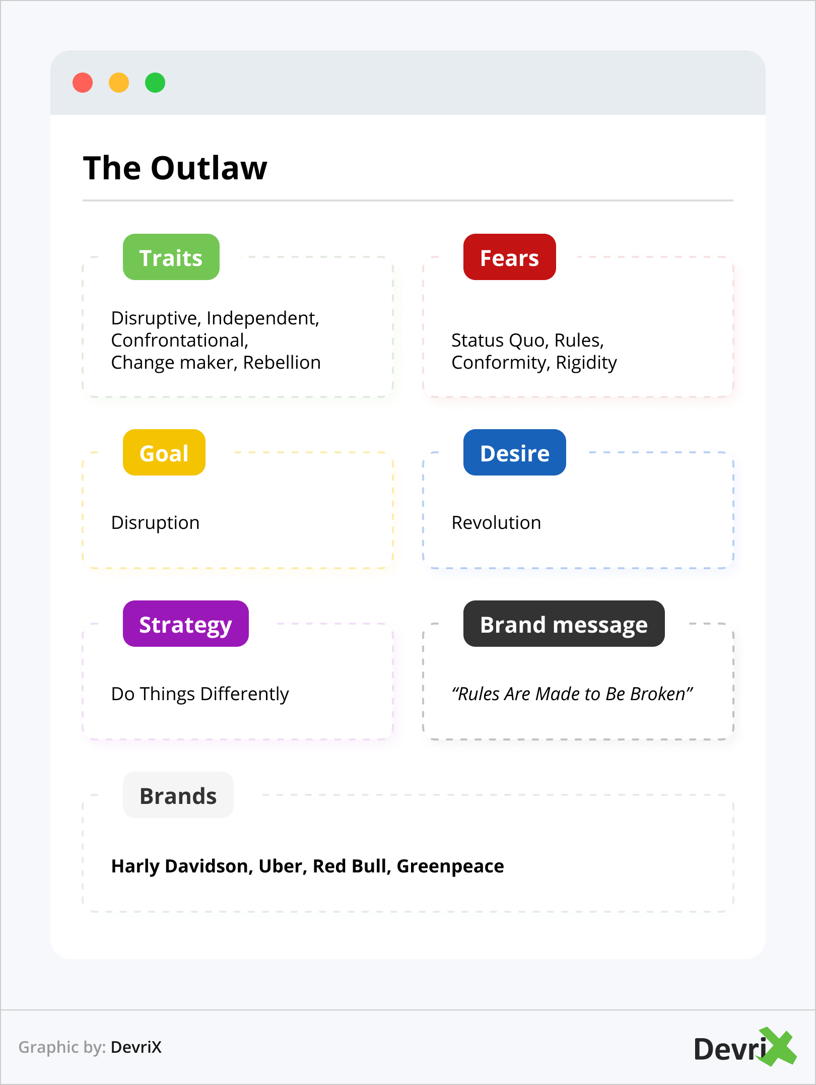 Pola dasar Outlaw, juga dikenal sebagai Pemberontak, ingin mempertanyakan otoritas dan, seperti namanya, melanggar aturan. Mereka berusaha untuk menantang status quo dan mengganggu industri mereka.