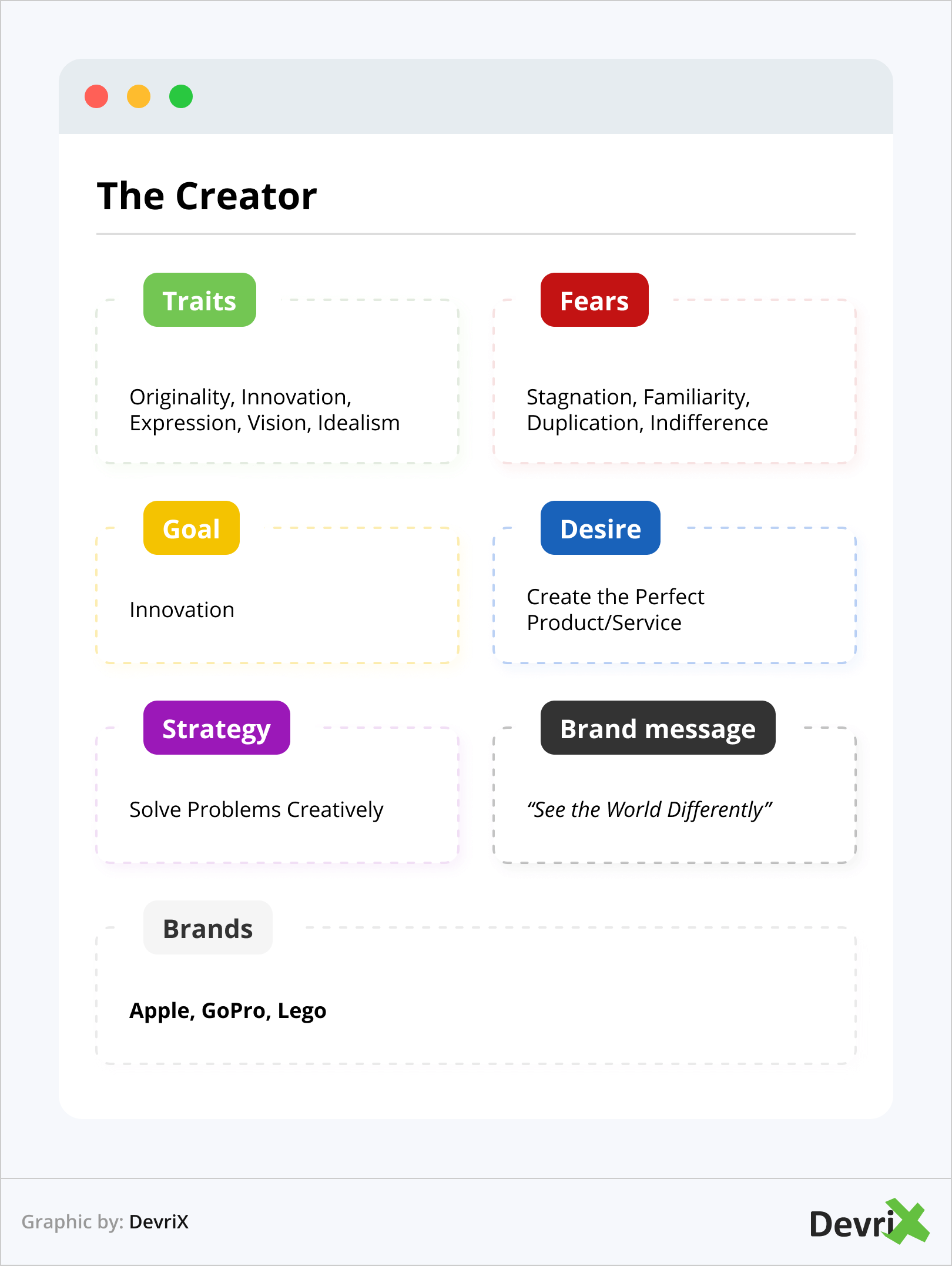 Dia menyebut arketipe ini – kompilasi tipe kepribadian merek berdasarkan nilai dan keinginan utama manusia seperti kepemilikan, kekuatan, dan keamanan.