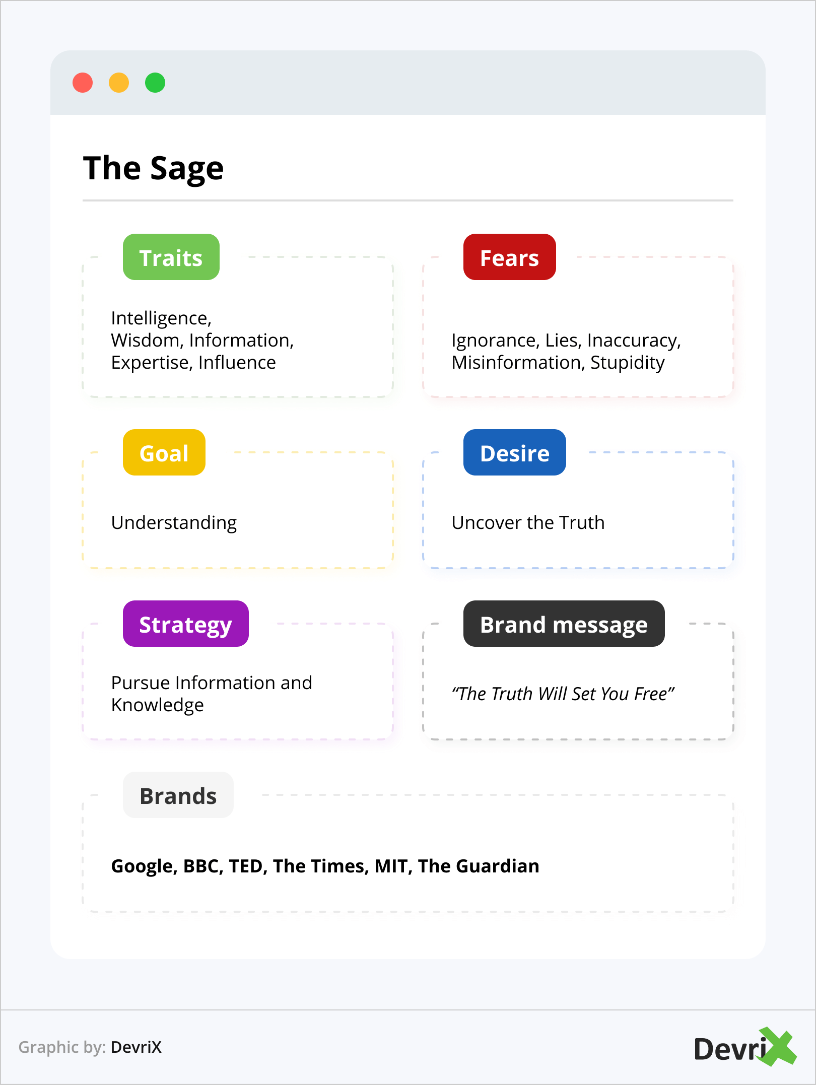 Merek dalam pola dasar ini percaya bahwa kebenaran akan membebaskan Anda. Mereka tidak berusaha untuk mengubah dunia, tetapi bertujuan untuk memberdayakan orang lain untuk melakukannya dengan memberi mereka informasi yang berharga. Karena itu, mereka biasanya adalah mentor yang sangat baik, pemimpin pemikiran, dan pembelajar seumur hidup