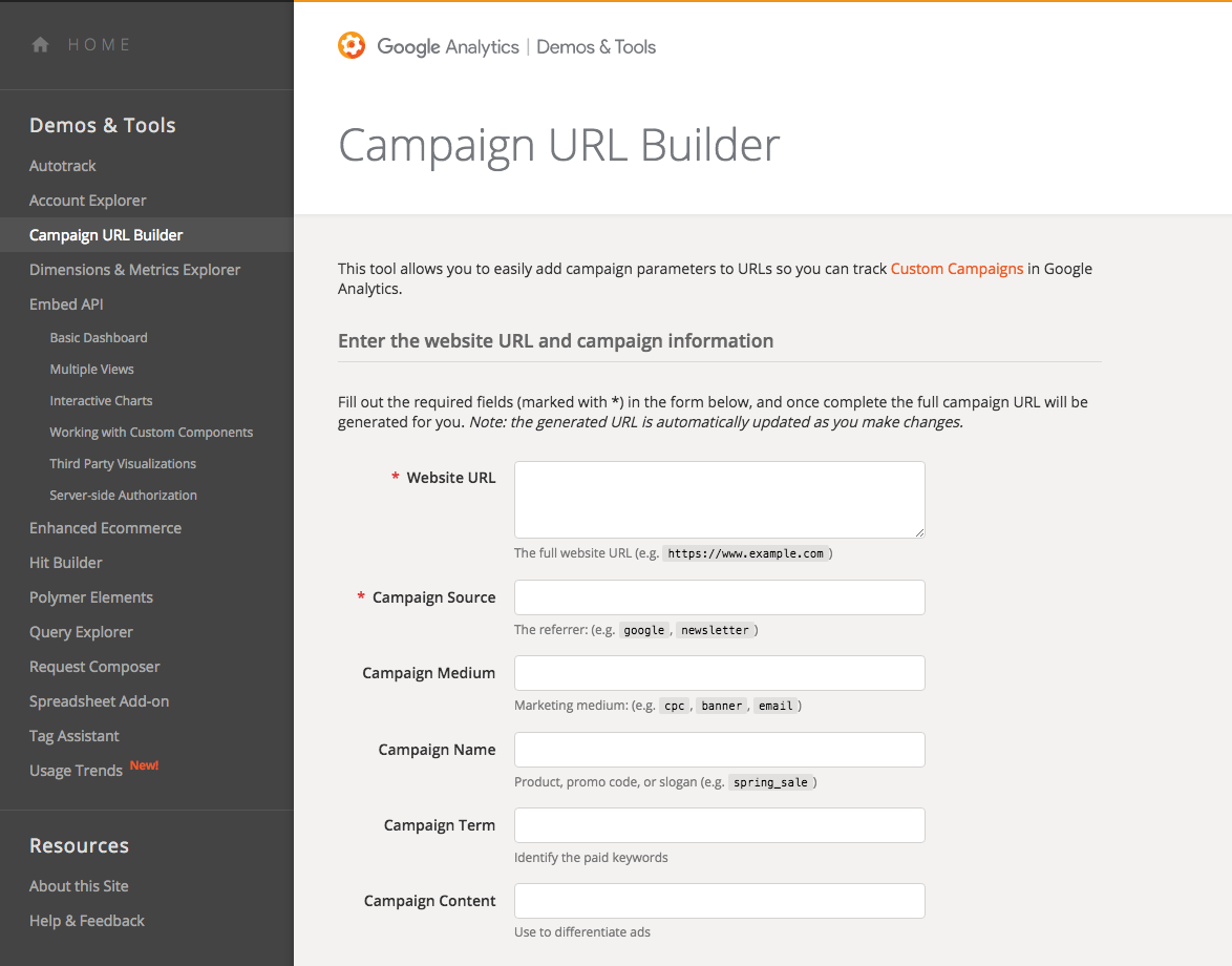 Alat dari Google ini menawarkan panduan untuk membangun pelacakan (juga dikenal sebagai UTM), yang sangat diperlukan oleh Google Analytics untuk melacak dan menganalisis lalu lintas dengan benar . Cukup masukkan sumbernya (seperti blog, situs web, atau halaman Facebook) dan semua bidang tambahan yang menurut Anda berguna, untuk kemudian menemukannya di Analytics Anda.