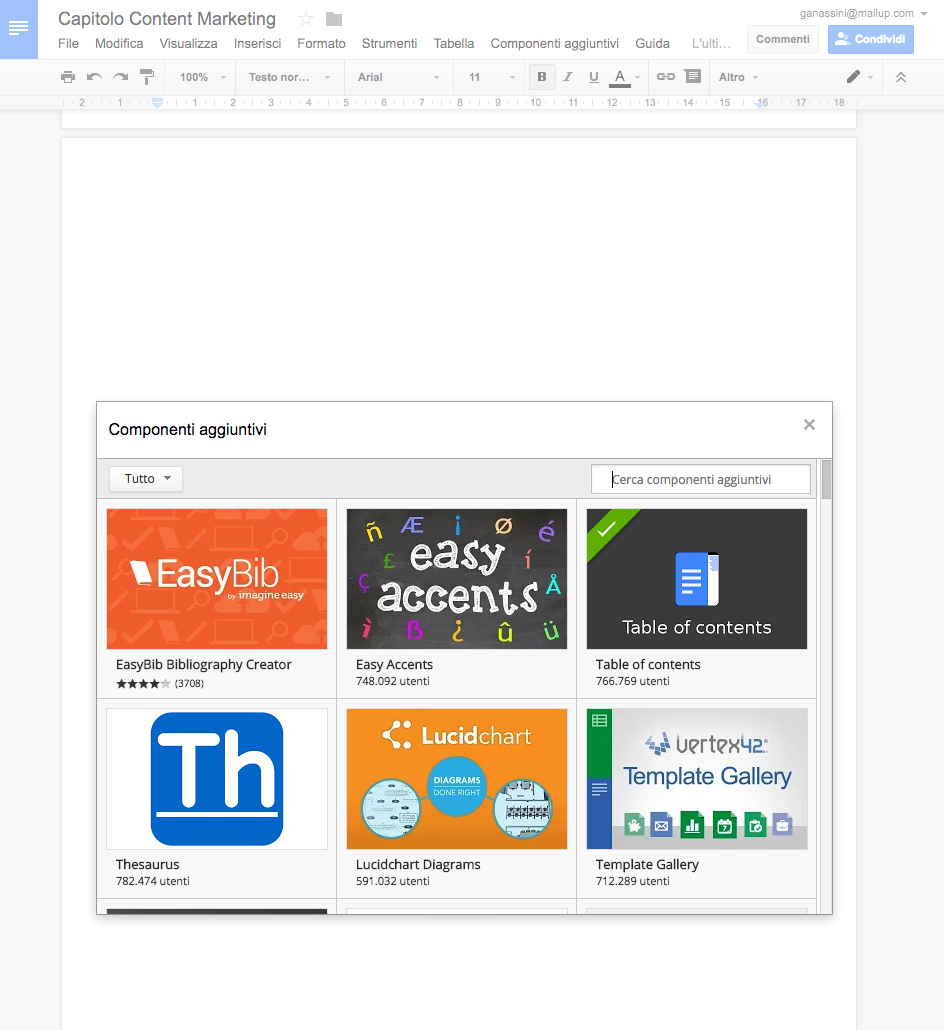 Banyak orang tidak tahu bahwa halaman kosong sederhana di Google Documents dapat diperkaya dengan banyak fitur tambahan – Anda hanya perlu tahu di mana mencarinya! Cukup klik Add-Ins> Instal Add-Ins dari menu di atas untuk membuka jenis toko yang akan digunakan untuk menginstal fitur yang paling serbaguna . Kesukaanku? Penghitungan Kata yang Lebih Baik untuk memudahkan penghitungan kata, dan Daftar Isi , yang menambahkan daftar isi ke kolom sebelah kiri yang diisi dan diedit saat saya menulis. Tapi benar-benar ada sesuatu untuk semua selera dan kebutuhan.