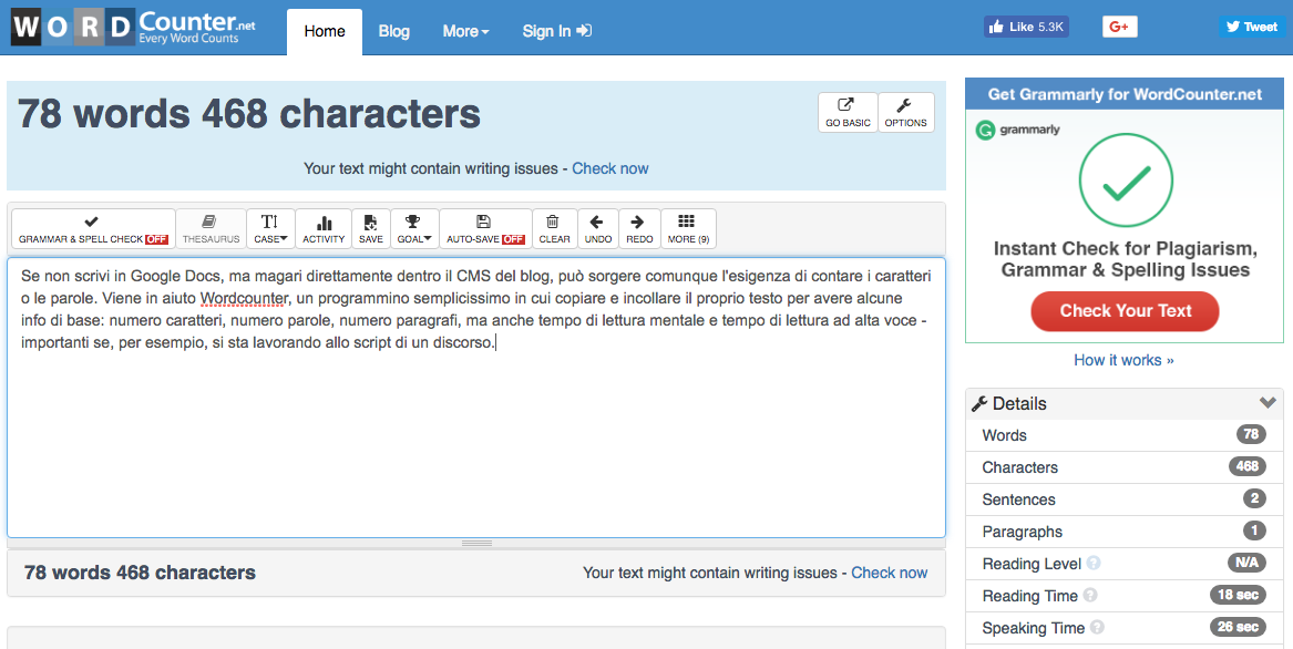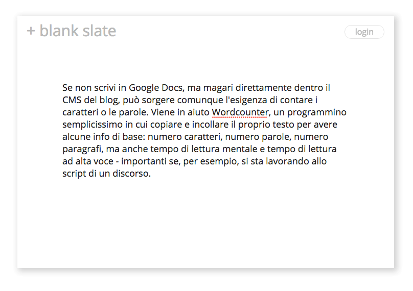 Jika Anda tidak menggunakan Google Documents untuk menulis dokumen Anda, tetapi mungkin menulisnya langsung di dalam CMS blog Anda, Anda mungkin masih perlu menghitung karakter atau kata. Wordcounter sangat berguna untuk tugas ini; itu adalah program yang sangat sederhana di mana Anda menyalin dan menempelkan teks Anda sendiri untuk mendapatkan beberapa info dasar: jumlah karakter, jumlah kata, jumlah paragraf, tetapi juga waktu membaca mental dan waktu membaca vokal , yang sangat penting jika Anda ' sedang mengerjakan naskah pidato, misalnya.