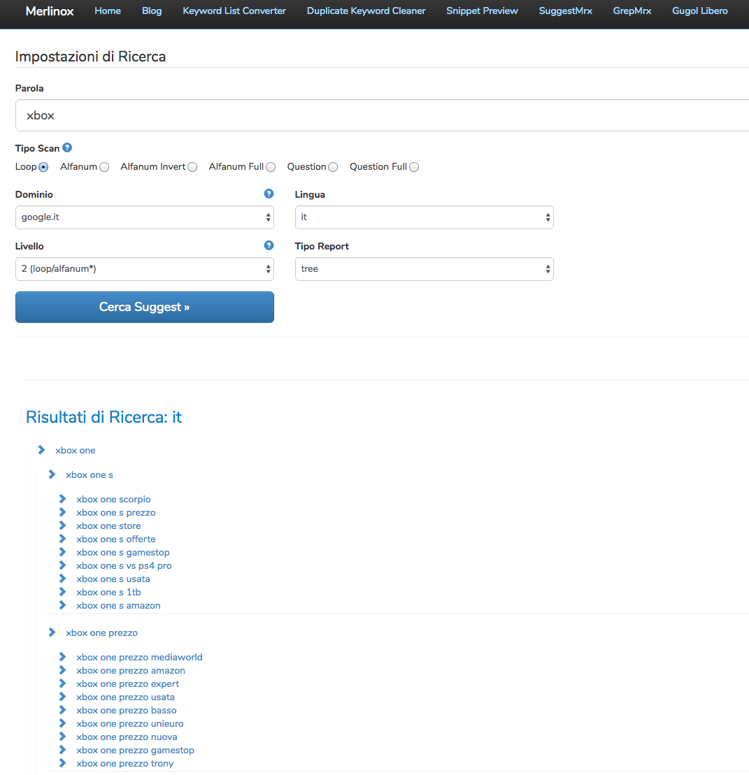 Kedua alat ini (dengan antarmuka dan fitur yang sangat mirip) dibuat untuk SEO, dengan tujuan menyediakan ekstensi kata kunci yang dicari. Mereka sangat nyaman untuk mengidentifikasi kata kunci yang paling tepat untuk dimasukkan dalam setiap posting blog untuk memaksimalkan potensi peringkat SEO-nya. Akhir-akhir ini saya lebih suka Merlinox, yang menurut saya lebih jelas dan lebih efektif. Untuk mendapatkan pohon, ingatlah untuk memilih 2(loop/alfanum) di menu Level .