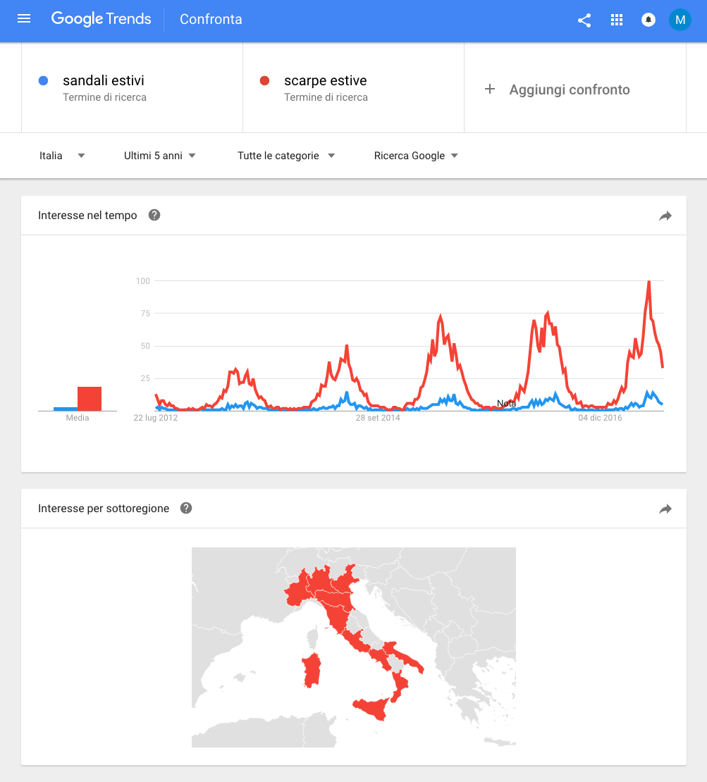 Selain menawarkan tips menarik tentang topik pencarian paling populer, Google Trends menawarkan kemampuan untuk membandingkan volume pencarian untuk kata kunci tertentu, yang menunjukkan variasi waktu dan korelasi dengan kata kunci menaik lainnya. Ini sangat penting untuk memahami kata kunci mana yang akan ditargetkan (“sandal musim panas” atau “sepatu musim panas”?), dan untuk mengidentifikasi musim penting apa pun untuk penerbitan konten.