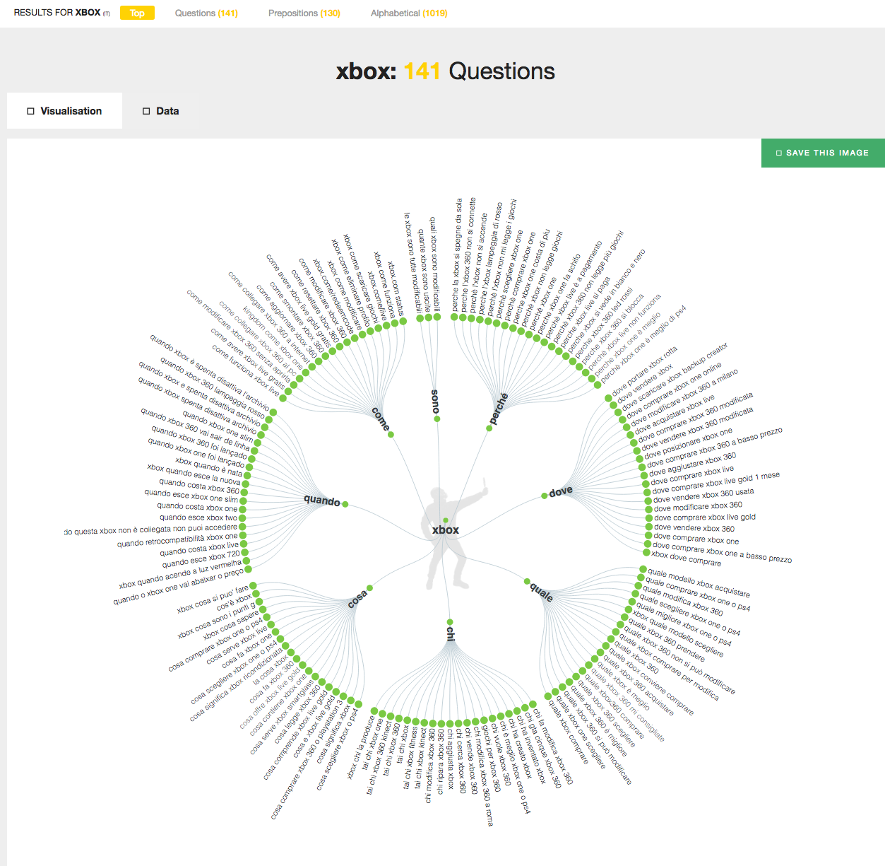 Seorang lelaki tua yang ramah menyambut kami di beranda AnswerThePublic, alat khusus untuk mempelajari tentang pertanyaan yang diajukan ke Google oleh pengguna terkait dengan kata kunci. Cukup ketik kata kunci, pilih bahasa referensi, dan Anda selesai: sistem akan memberi Anda pertanyaan yang diajukan Google terkait dengan pencarian itu, preposisi yang menyertainya, dan kueri yang diperluas. Tidak ada data volume (jadi sulit untuk menetapkan bobot untuk setiap pertanyaan), tetapi tampilan grafik yang nyaman (juga dapat diunduh) mengkompensasi kekurangan ini.