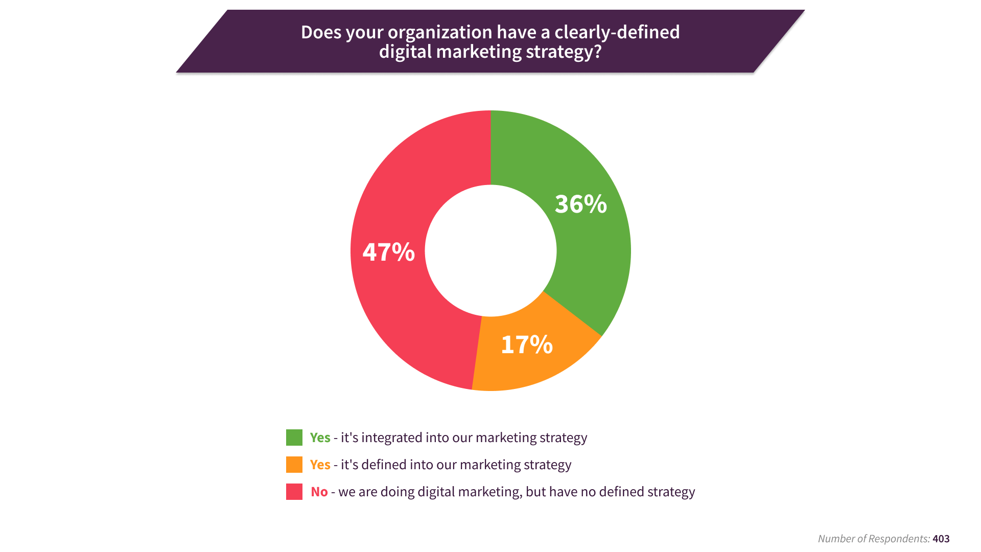 Yang mengejutkan, hampir setengah (47%) bisnis tidak memiliki strategi pemasaran digital, tetapi mereka melakukan pemasaran digital! Selama lima belas tahun kami telah meneliti adopsi perencanaan untuk pemasaran digital, kami telah menemukan persentase bisnis tanpa pendekatan terencana tetap sama, menunjukkan adanya hambatan yang signifikan untuk mengintegrasikan perencanaan dalam organisasi.