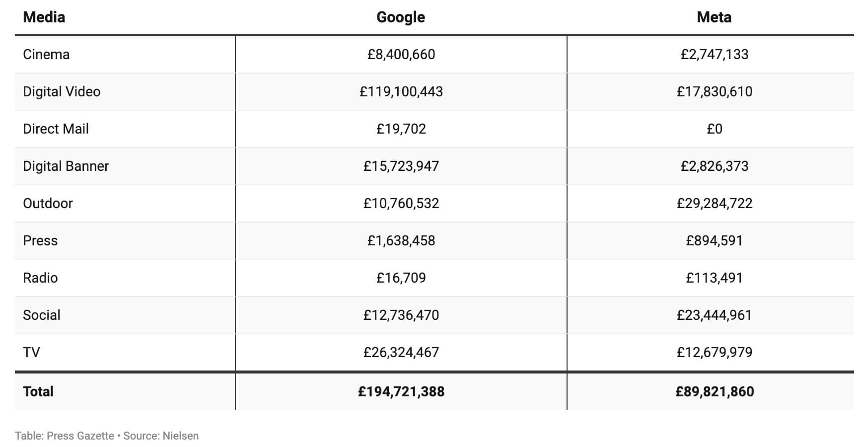 Sangat menarik untuk melihat pembelanjaan iklan dari dua pembelanjaan media digital terbesar yang membelanjakan jumlah yang signifikan pada media tradisional sebagai bagian dari campuran media yang seimbang meskipun Google memiliki investasi besar dalam video digital.