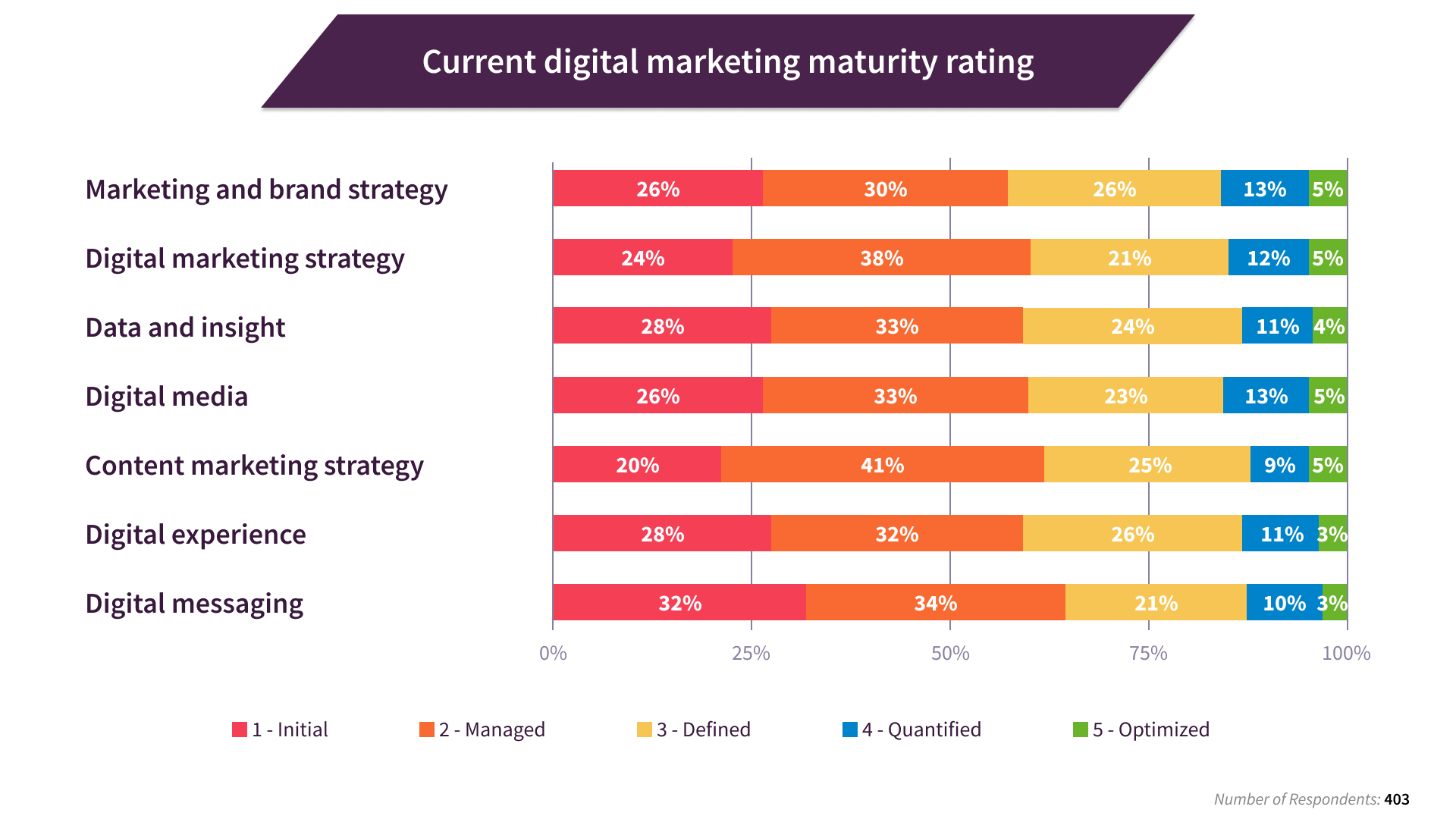 Kemampuan tujuh pilar keberhasilan pemasaran dapat ditinjau untuk bisnis yang berbeda antara satu (maturitas rendah) hingga lima (maturitas maksimum) menggunakan evaluasi tolok ukur maturitas digital yang ditampilkan dalam Ringkasan Eksekutif laporan ini.