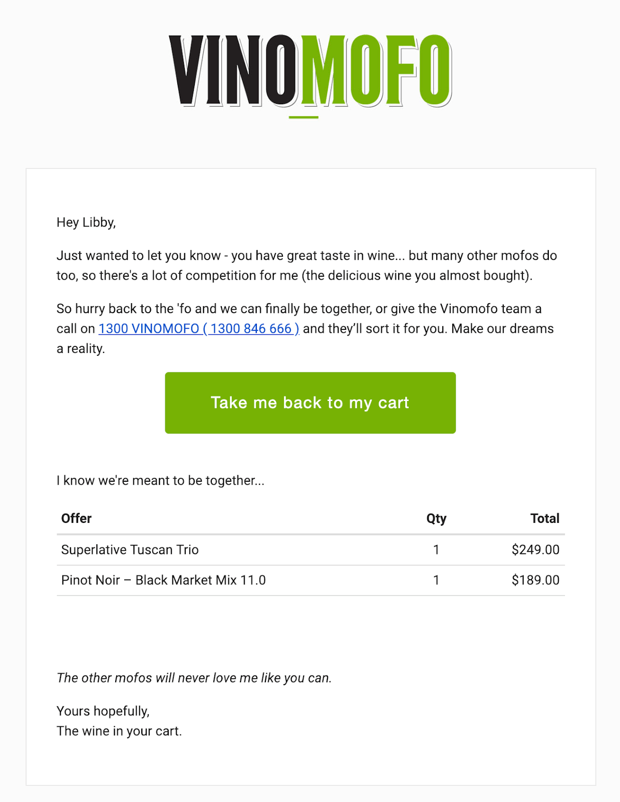 Berikut adalah contoh yang bagus dari salinan email keranjang terbengkalai yang dipersonalisasi dari Vinomofo: