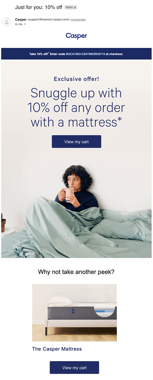 Misalnya, coba bereksperimen dengan foto di email Anda seperti ini dari Casper: