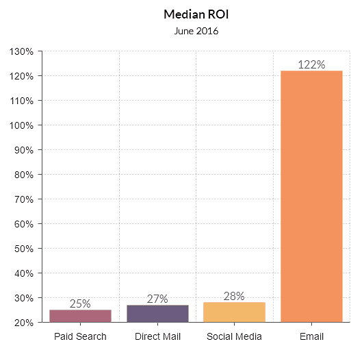 Tidak ada yang bisa mengalahkan itu. Faktanya, ROI median untuk pemasaran email lebih dari 4x lebih tinggi daripada media sosial: