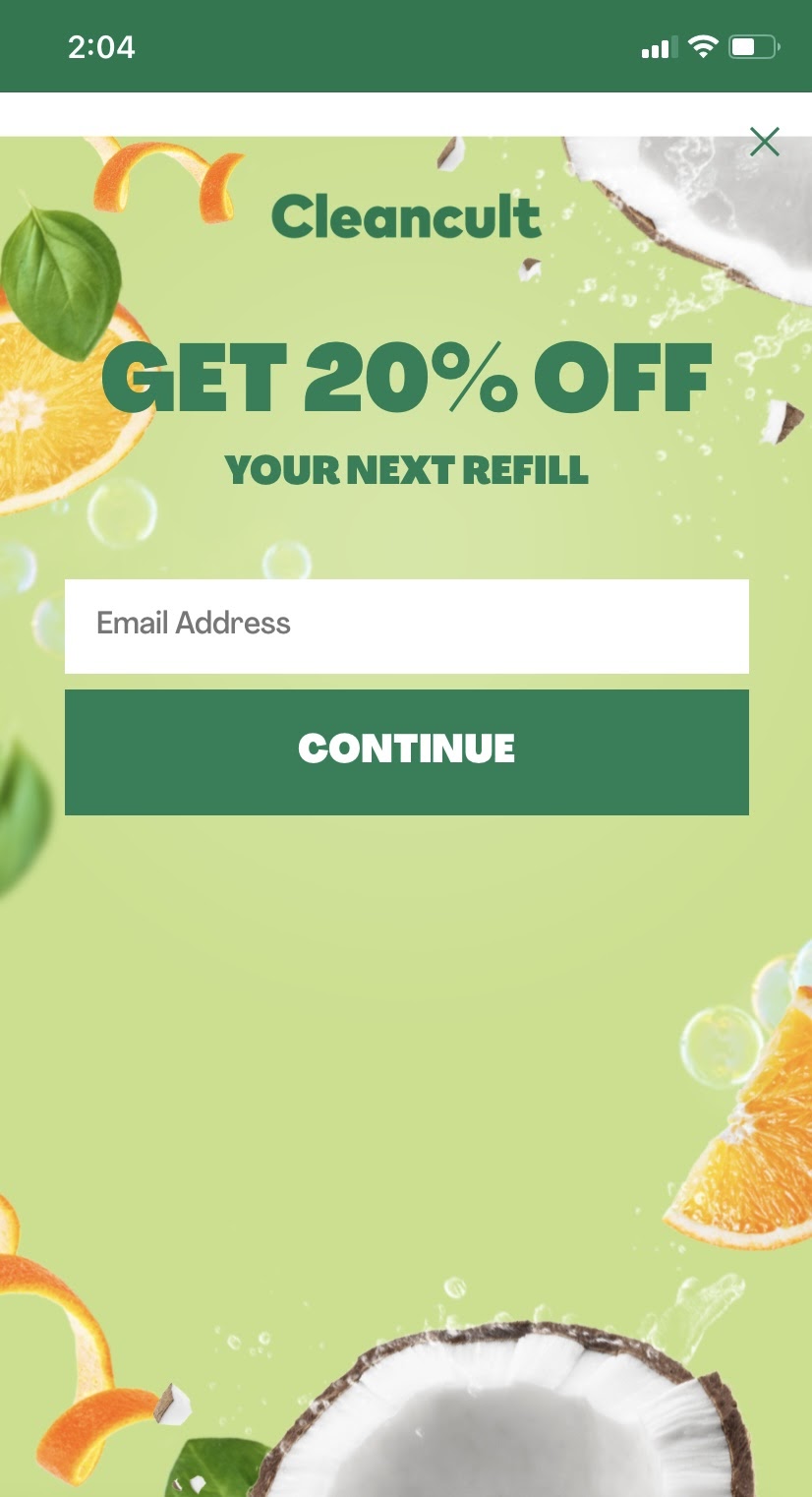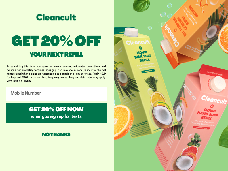 - Pilih pop-up cerdas. Munculan cerdas memanfaatkan penempatan konversi tinggi seperti niat keluar. Mereka dapat mempersonalisasi UX di situs dengan tidak menampilkan pop-up kepada mereka yang sudah ada di daftar Anda dan membuatnya lebih mudah untuk mengelompokkan kontak yang dikonversi melalui formulir kontak. Contoh dari Cleancult ini hanya ditampilkan kepada mereka yang sudah berlangganan! Alat seperti Justuno yang baru saja mengintegrasikan Sendlane adalah tempat yang bagus untuk memulai.
