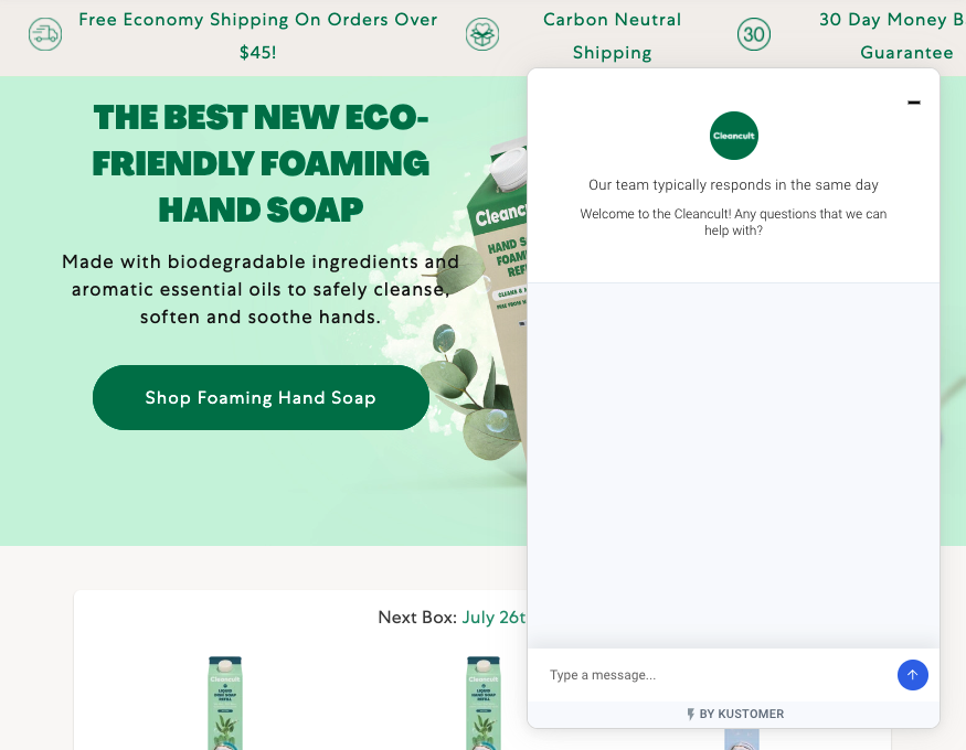 - Permudah orang untuk menghubungi dukungan. Hampir tidak ada yang menimbulkan rasa tidak enak di mulut seperti dukungan yang tidak mendukung. Sekali lagi ini adalah titik di mana navigasi situs yang baik adalah kuncinya. Setiap merek akan menemukan jalur yang paling berhasil, dan itu bisa dalam bentuk Bot Obrolan situs yang dicampur dengan halaman FAQ atau formulir kontak email. Apa pun yang Anda rencanakan, buatlah itu mudah ditemukan! Cleancult menggunakan gelembung obrolan statis di sudut bawah situs, sehingga tim mereka selalu hanya dengan sekali klik.