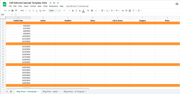 Misalnya, tim redaksi CMI mendasarkan kalender editorialnya pada template seperti ini untuk blog. Ini merinci informasi produksi untuk artikel setiap hari – judul, penulis, kategori topik, dan status alur kerja. (Unduh salinan Anda sendiri dan sesuaikan sesuai kebutuhan).