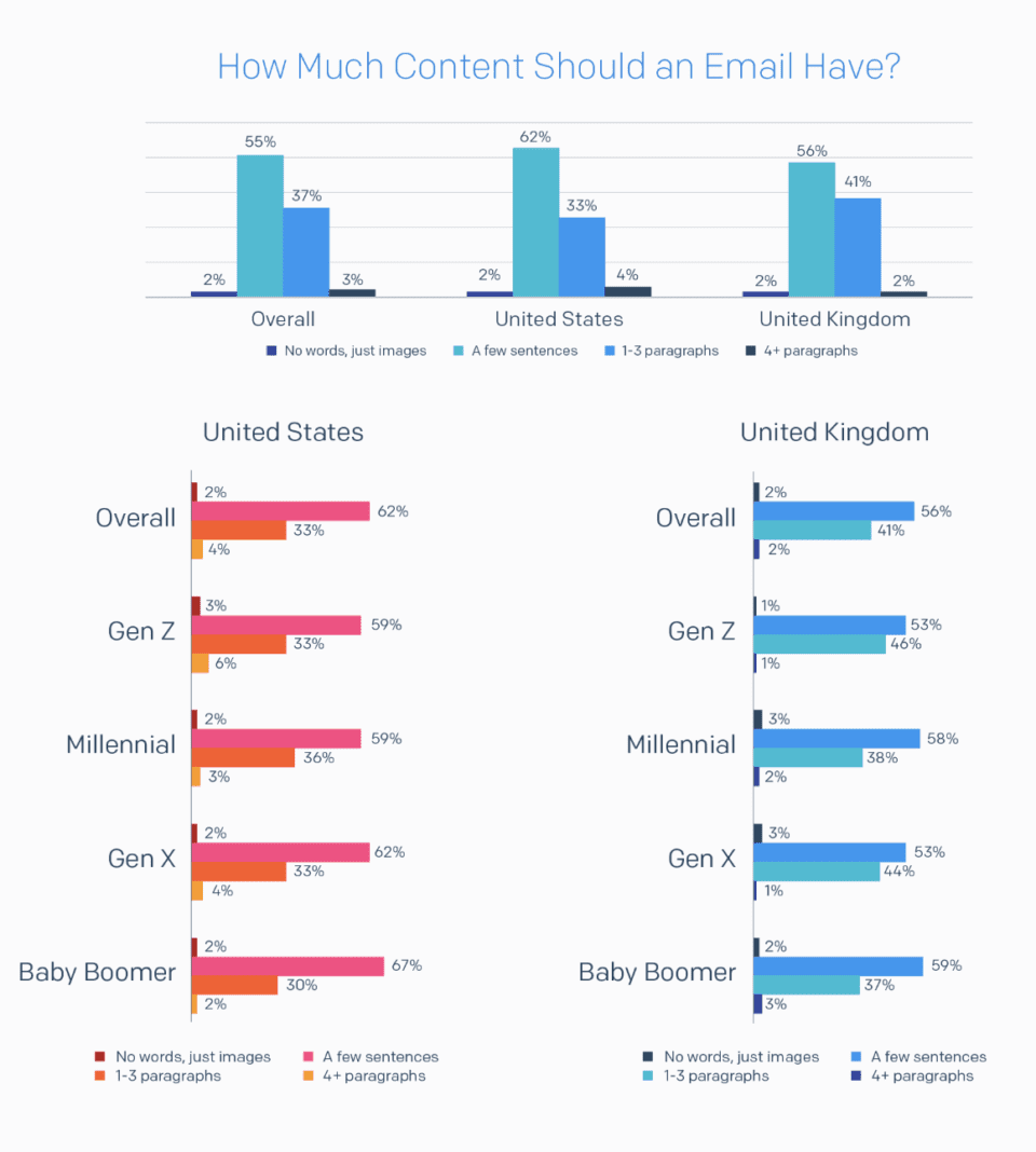 - Salah. Hanya 3% responden Gen Z di AS yang lebih menyukai semua gambar, tidak ada opsi teks untuk email mereka. Perhatikan bahwa pendekatan ini buruk untuk kemampuan pengiriman Anda (baca: rasio gambar ke teks). Namun bukan berarti mereka menginginkan esai pendek tanpa gambar—59% responden hebat hanya dengan beberapa kalimat.