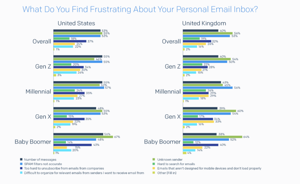 Penyebab utama frustrasi kotak masuk untuk Gen Z adalah pengirim yang tidak dikenal, filter spam yang tidak dikonfigurasi dengan baik, dan banyaknya pesan yang mereka terima.