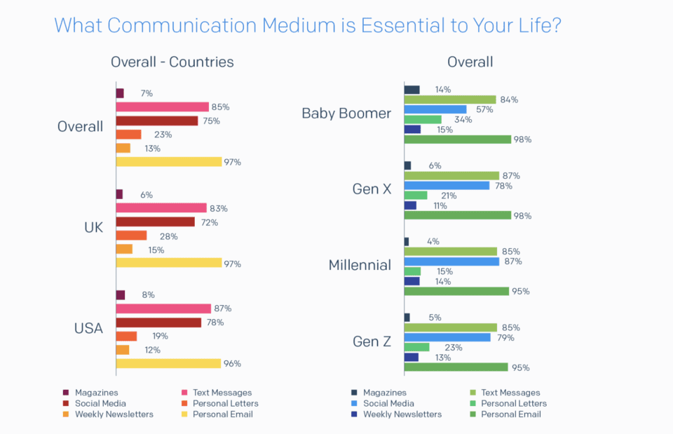 95% responden Gen Z mengatakan bahwa email pribadi sangat penting bagi kehidupan mereka. Pesan teks menduduki peringkat paling penting berikutnya dengan 85% responden mengatakan itu juga penting.