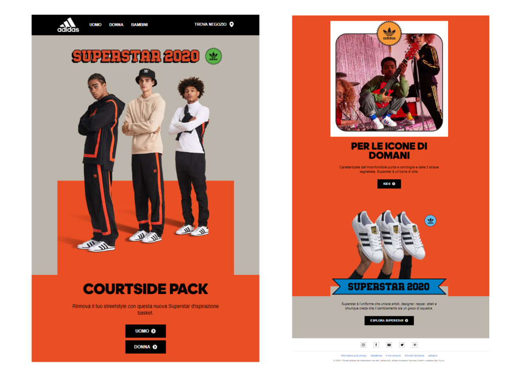 Jika sebagian besar penelitian merekomendasikan untuk menjaga jumlah kata keseluruhan antara 75 dan 100 , maka aturan umum terbaik adalah: semakin tinggi kecenderungan untuk mengklik email, semakin banyak salinan yang dapat disimpan dengan ketat dan ringkas . Berikut ini contoh bagus dari Adidas: