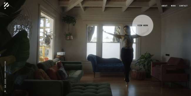 Video sinematografi murni perulangan layar penuh menyambut pengunjung, sementara menu utama tiga item berada di kanan atas, dengan font sans serif sederhana. Kursor mouse pengunjung mengambil bentuk bulat dengan teks "Lihat Pekerjaan" yang mengklik ke halaman portofolio situs.
