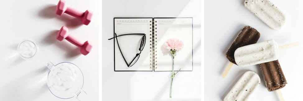 Untuk foto flat lay, sebaiknya pikirkan di mana bayangan Anda akan mendarat saat difoto. Saya telah menemukan bahwa lebih baik dan lebih menyenangkan bagi mata untuk bayangan mendarat di kiri atau kanan objek dibandingkan dengan bayangan mendarat di atas objek. Dalam contoh di bawah ini, lihat bagaimana bayangan dapat menjadi komponen besar atau kecil dari foto Anda – tergantung pada efek yang Anda inginkan.