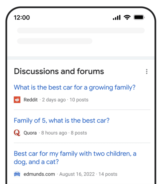 Google Penelusuran hari ini mungkin menampilkan bagian untuk "diskusi dan forum", hari ini untuk hasil bahasa Inggris AS. Ini untuk membantu orang menemukan pengalaman langsung dari orang-orang tentang topik tersebut di berbagai forum diskusi online, termasuk Reddit tetapi lebih dari sekadar platform forum tunggal.