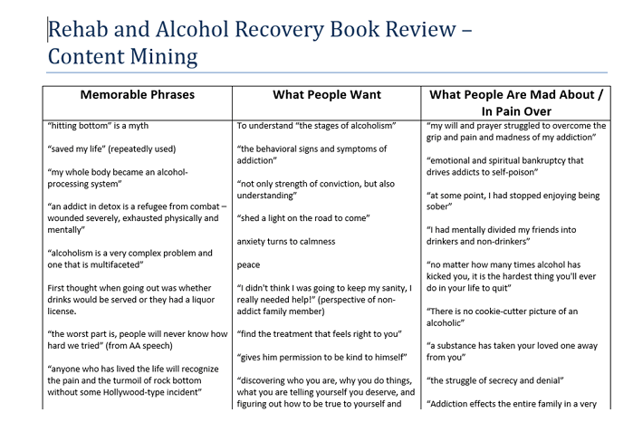 Ketika dia perlu menemukan pesan yang tepat untuk fasilitas rehabilitasi kecanduan, dia meminta bantuan Amazon. Dia membaca lebih dari 500 ulasan buku, dan mengatur bahasa audiensnya dalam bagan ini.