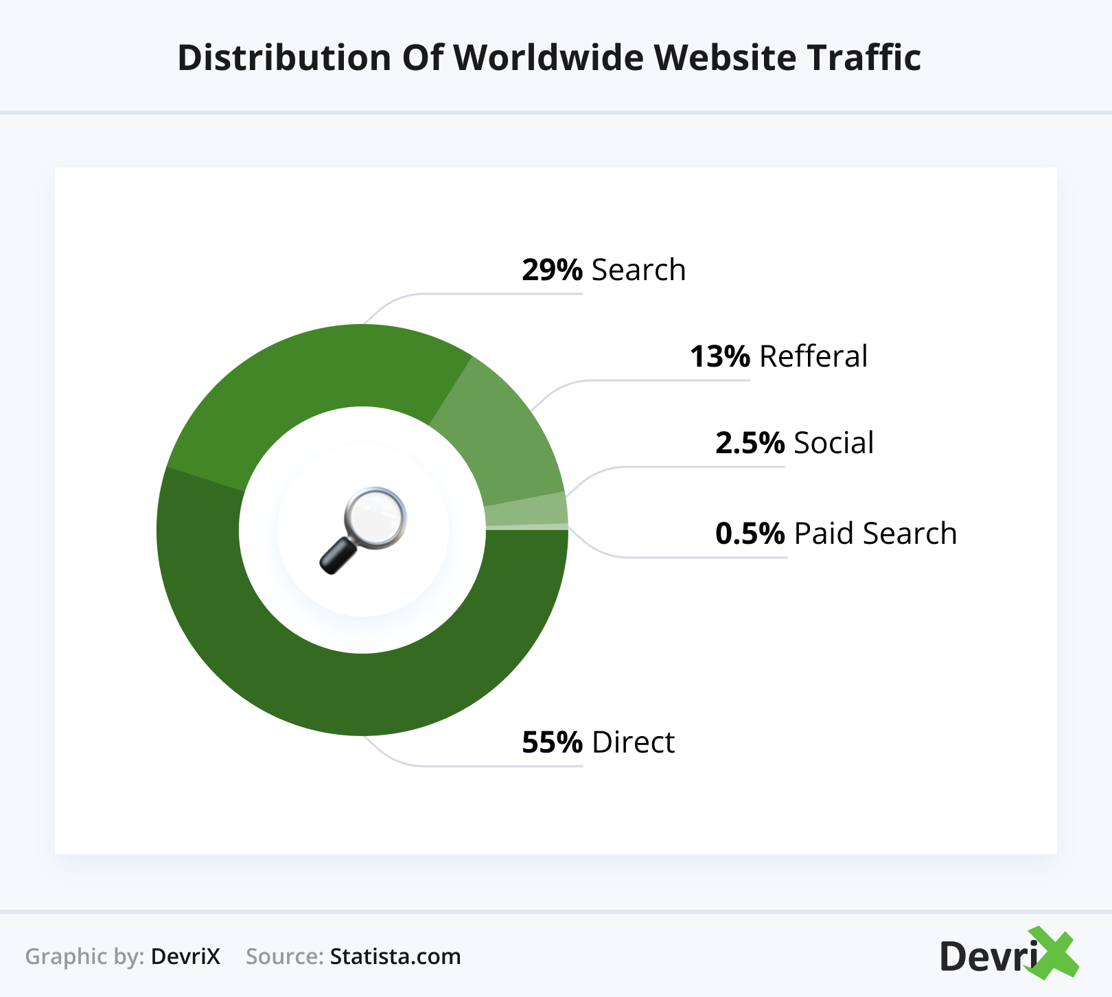Menurut penelitian, hampir 30% dari semua lalu lintas internet di seluruh dunia berasal dari mesin pencari, yang menjadikannya sumber lalu lintas paling populer kedua setelah langsung memasukkan domain lengkap. Pada saat yang sama, penelitian yang berbeda menunjukkan bahwa lebih dari setengah orang menyebut Penelusuran sebagai cara yang mereka sukai untuk meneliti merek.