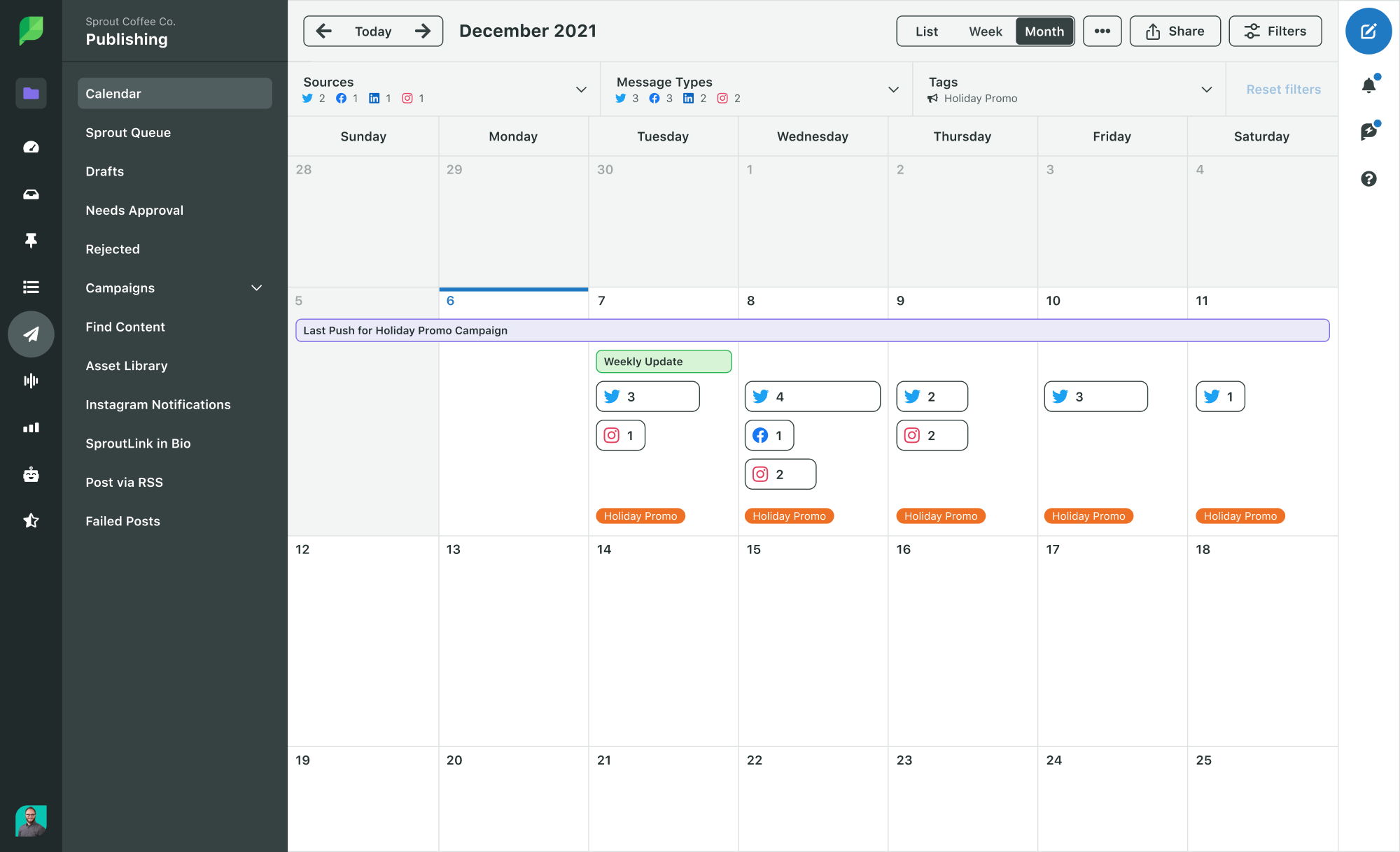 Lihat di bawah seperti apa tampilan kalender penerbitan langsung di Sprout. Dengan platform manajemen kampanye kami, Anda dapat mengelola pos sosial sehari-hari bersama kampanye jangka pendek atau jangka panjang Anda dalam satu aplikasi. Hanya dengan memiliki visual ini membuat kampanye Anda tidak terlalu menakutkan dan juga memudahkan untuk memindahkan konten jika perlu.