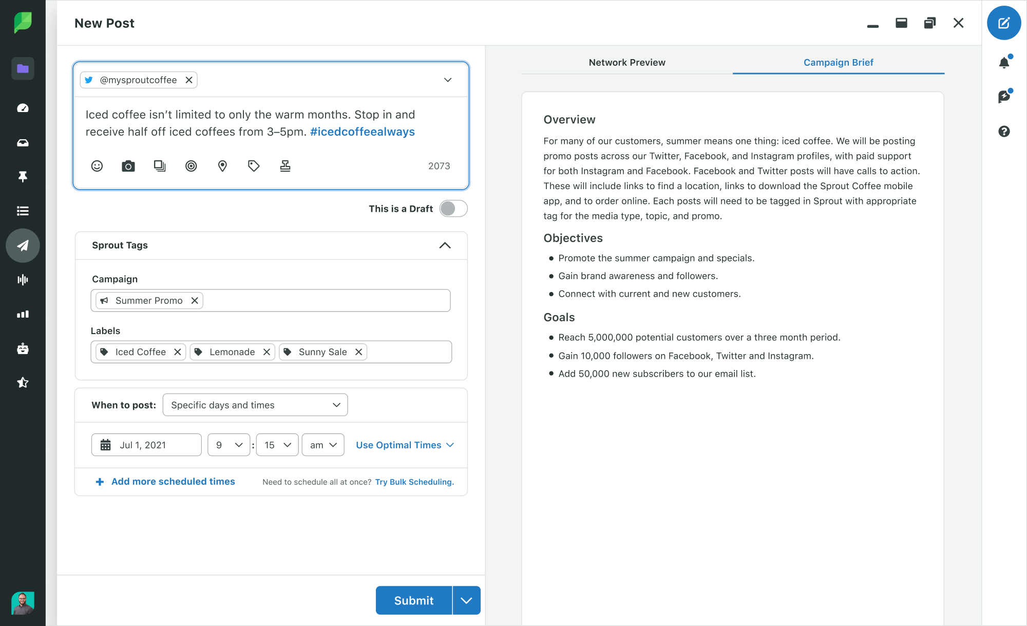 Misalnya, inilah awal dari kampanye yang ditentukan di platform Sprout Social. Dengan pernyataan misi, tujuan spesifik, dan garis waktu yang ditetapkan, Anda akan lebih mungkin untuk menindaklanjuti dan menjaga kampanye Anda tetap pada jalurnya.