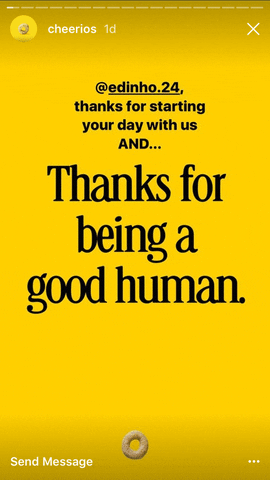 Cheerios menggunakan Instagram Stories untuk memberikan teriakan kepada pengikutnya dengan pesan pribadi. Keterlibatan seperti ini pasti akan mencerahkan hari mereka dan hanya dapat membantu menumbuhkan pengikut Cheerios: