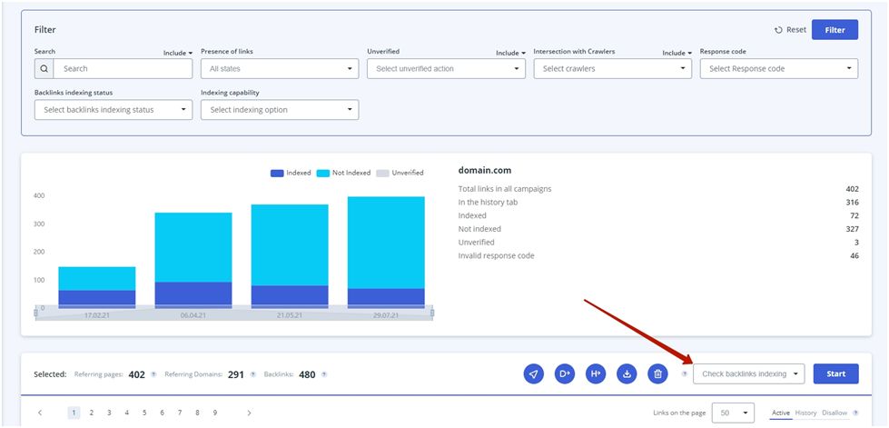 Anda dapat menemukan semua detail tentang backlink dan domain di tabel dan grafik. Tabel menganalisis tautan balik situs web Anda menggunakan filter yang berbeda.