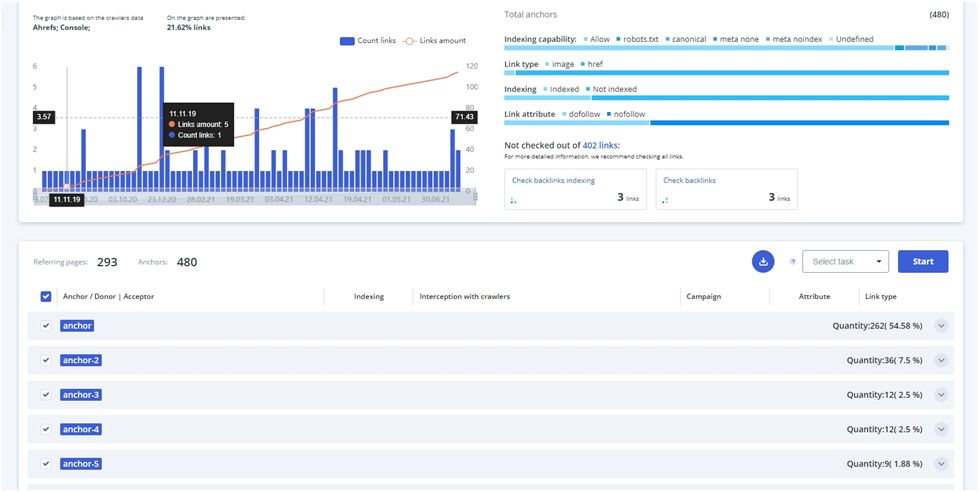 Ini memungkinkan Anda untuk mengindeks profil tautan dari kumpulan tautan tertentu ke halaman atau kumpulan jangkar tertentu. Pada grafik, Anda akan dapat melihat seberapa alami dan konsisten profil tautan tersebut.