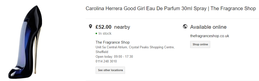 Iklan inventaris lokal ditampilkan di hasil pencarian saat pengguna mencari produk di Google. Misalnya, iklan Anda akan ditampilkan jika pengguna menelusuri frasa seperti “Calvin Klein cologne di dekat saya” atau “Gaun musim panas merah muda di sekitar”.