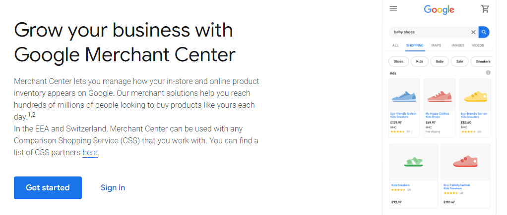 - Navigasikan ke situs web Google Merchant Center dan klik Mulai