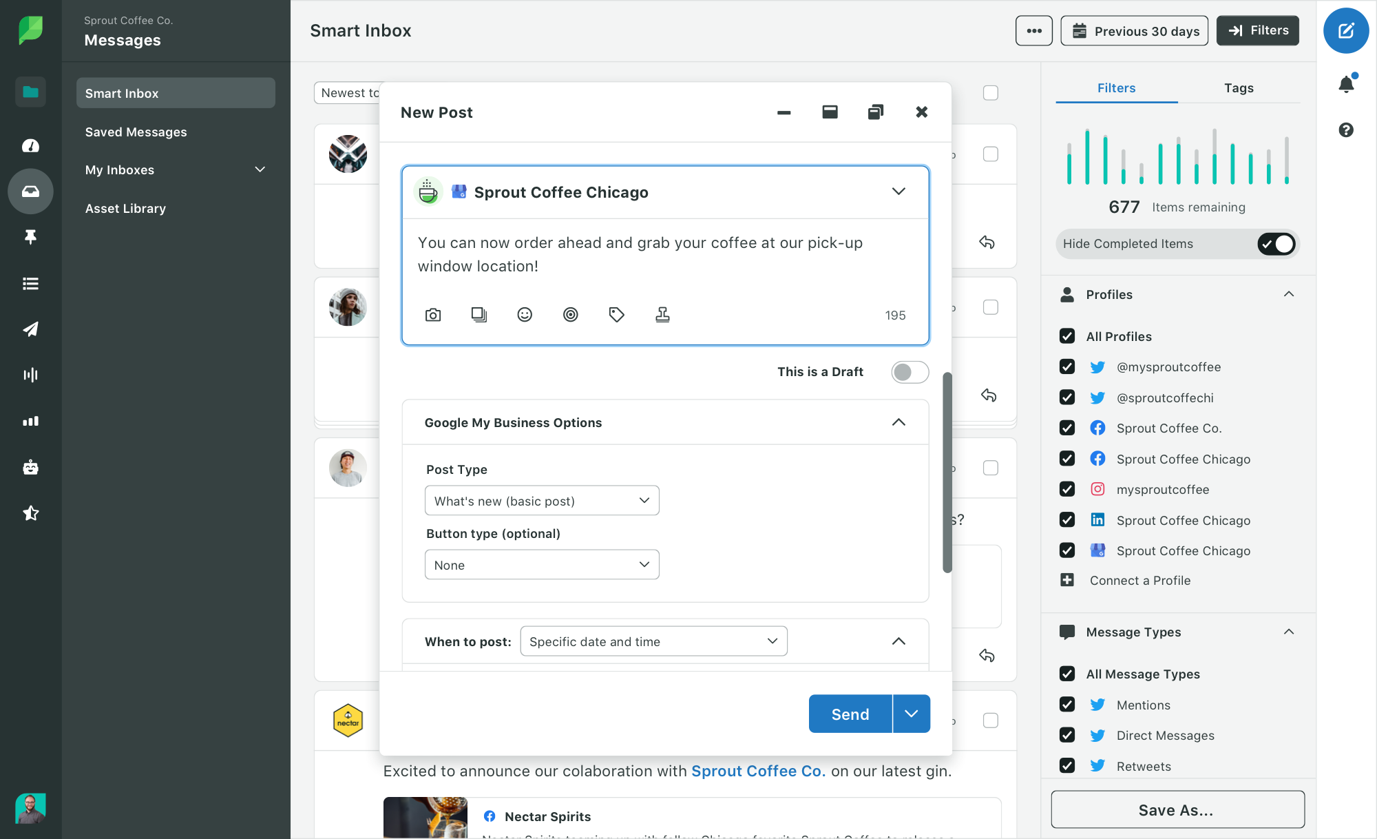 Anda dapat lebih mengoptimalkan profil GMB Anda dengan membagikan pembaruan bisnis dan konten segar secara teratur. Dan Sprout Social membuatnya lebih mudah dengan fitur baru untuk memposting langsung ke profil GMB Anda. Maksimalkan fitur Sprout GMB untuk memperbarui pelanggan Anda dengan apa yang baru dan berbagi detail tentang acara mendatang. Ini membantu Anda terhubung dengan pelanggan Anda pada tingkat yang lebih dalam selain meningkatkan visibilitas Anda dalam pencarian lokal.