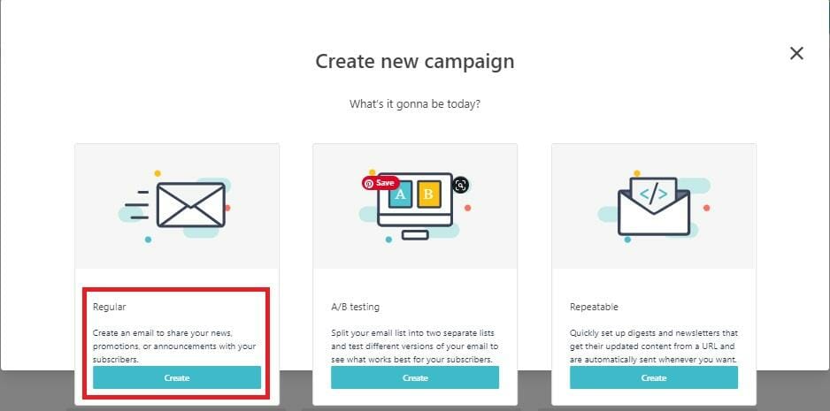Untuk membuat siaran reguler seperti buletin email, pesan atau pengumuman pemasaran, pilih Kampanye > Reguler, lalu klik 'Buat':