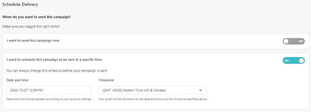 Setelah selesai, Anda dapat memilih untuk mengirim email segera atau menjadwalkannya untuk tanggal dan waktu berikutnya, serta apakah Anda ingin mengirim ulang email ke penerima yang tidak membuka pesan atau tidak.