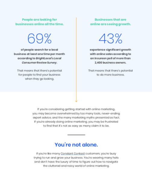 Salah satu hal yang ingin kami katakan kepada orang-orang yang mencari bantuan kami di Kontak Konstan adalah “Anda sudah mendapatkannya. Anda memiliki kami.” Dan kami percaya itu. Kami telah melihat orang-orang mulai terintimidasi, kewalahan, dan bingung oleh pemasaran online dan dengan cepat menjadi bersemangat karena mereka melihat bagaimana hal itu berdampak pada bisnis dan organisasi mereka.
