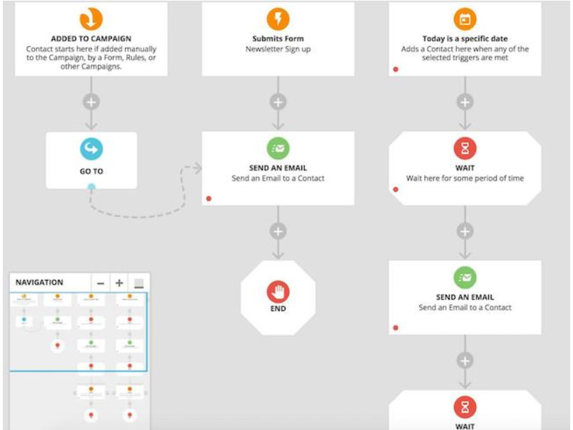 Dengan kata lain, pembuat kampanye menyertakan alat untuk merancang alur kerja otomatisasi visual. Bagan yang dihasilkan harus menunjukkan hubungan antara semua segmen, aturan, tag, dan pesan kampanye yang relevan dalam format grafis. Hasilnya, Anda akan dapat melihat cetak biru kampanye Anda serta data kemajuannya secara waktu nyata.