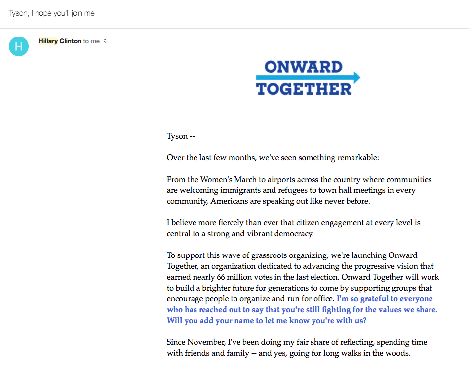 Untuk gerakan baru mantan kandidat presiden Hillary Clinton, tindakan itu adalah "Menolak, bersikeras, bertahan, mendaftar." Dan untuk menginspirasi mereka, dia memanfaatkan kekuatan personalisasi dan halaman arahan pasca-klik yang persuasif. Dalam langkah pertamanya pasca pemilihan, dia terus mendesak semua orang Amerika untuk membiarkan suara mereka didengar dengan meluncurkan Maju Bersama.
