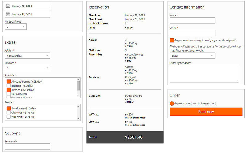 Sistem ini sangat ideal untuk orang-orang dalam bisnis akomodasi. Anda dapat menyesuaikan reservasi klien berdasarkan malam atau hari dengan checkout pagi. Anda dapat menawarkan diskon, kupon, dan penawaran khusus lainnya kepada pelanggan Anda. Anda juga dapat menambahkan fasilitas atau layanan tambahan untuk setiap pemesanan jika Anda mau.