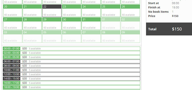Halaman produk akan menampilkan ketersediaan kalender pemesanan untuk pelanggan Anda. Mereka dapat menambahkan reservasi yang mereka inginkan (periksa demo).