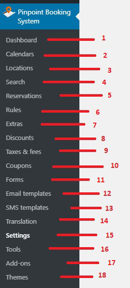 Setelah menginstal plugin WordPress Pinpoint Booking System, Anda akan mendapatkan tab baru untuk Pinpoint di dasbor Anda. Berikut adalah deskripsi dari setiap pengaturan: